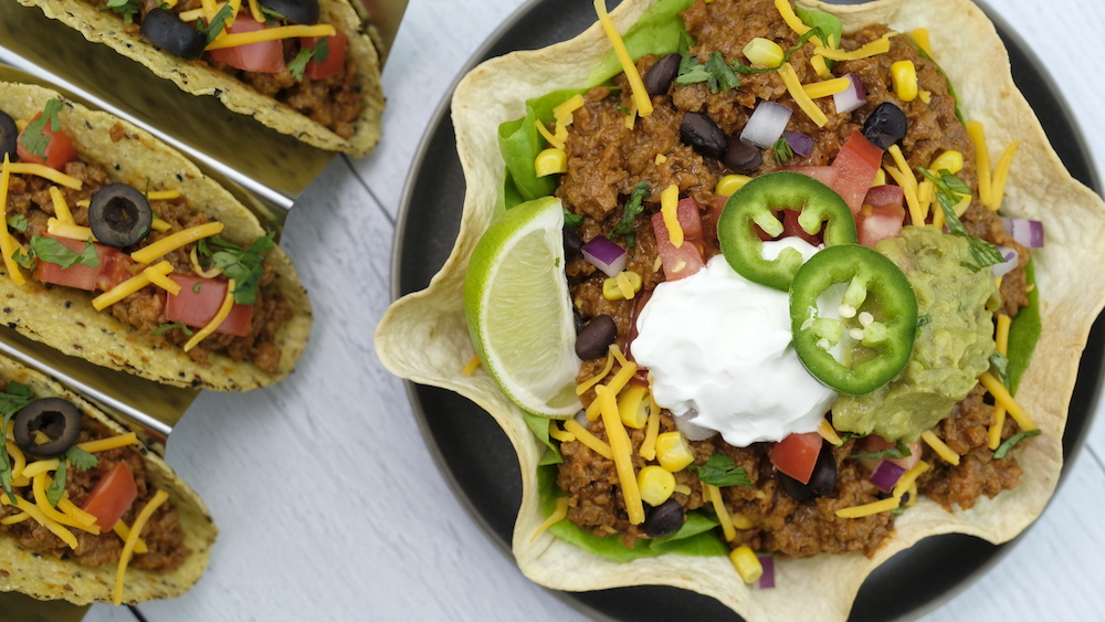 In a bowl or a fried or baked tortilla bowl, build the salad with greens and veggies of choice. Top each salad with a 4oz serving of Modern Menu Taco filling and desired garnishes.